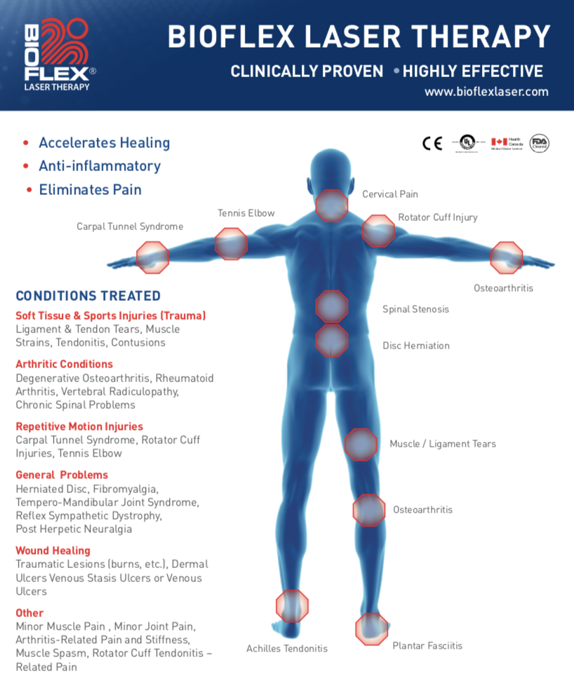 It helps resolve pain and other symptoms, without any side effects. It reduces inflammation, promotes tissue repair, decreases pain, reduces edema, improves mobility, and reduces the need for medication.